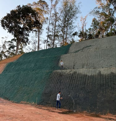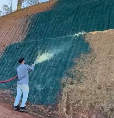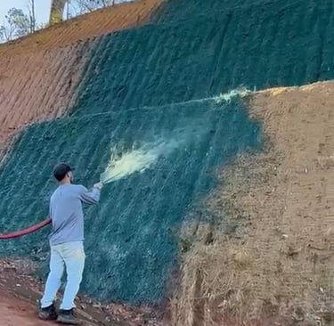 Para taludes e encostas com inclinação superior a 45 graus ou solos de alta complexidade, a hidrossemeadura é combinada com a instalação de Biomantas de Fibra de Coco. Este material 100% natural e biodegradável atua como um reforço geotêxtil, oferecendo proteção imediata e permanente contra a erosão, enquanto as sementes germinam por baixo. A manta de coco estabiliza a superfície e cria o microclima ideal para o desenvolvimento das raízes, garantindo a fixação e a longevidade da cobertura vegetal mesmo nas áreas mais críticas e sujeitas a grandes volumes de chuva.