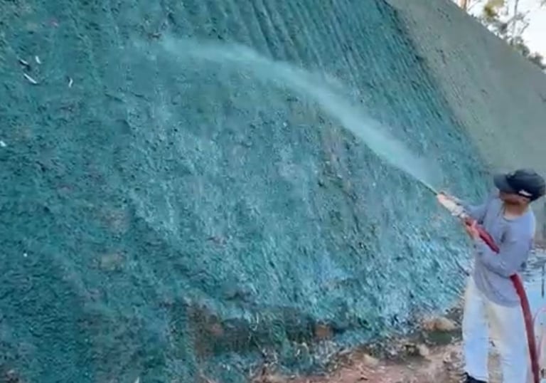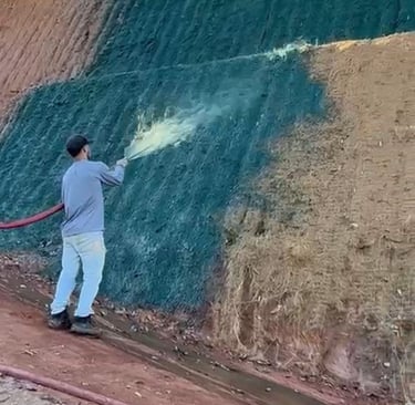 Técnica de plantio que aplica, por jateamento, uma mistura de sementes, água, adubo e mulch para cobertura rápida e uniforme do solo.